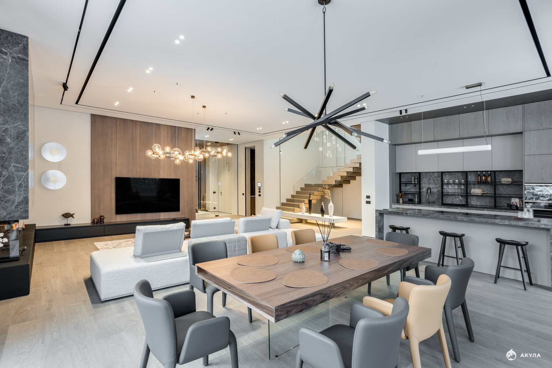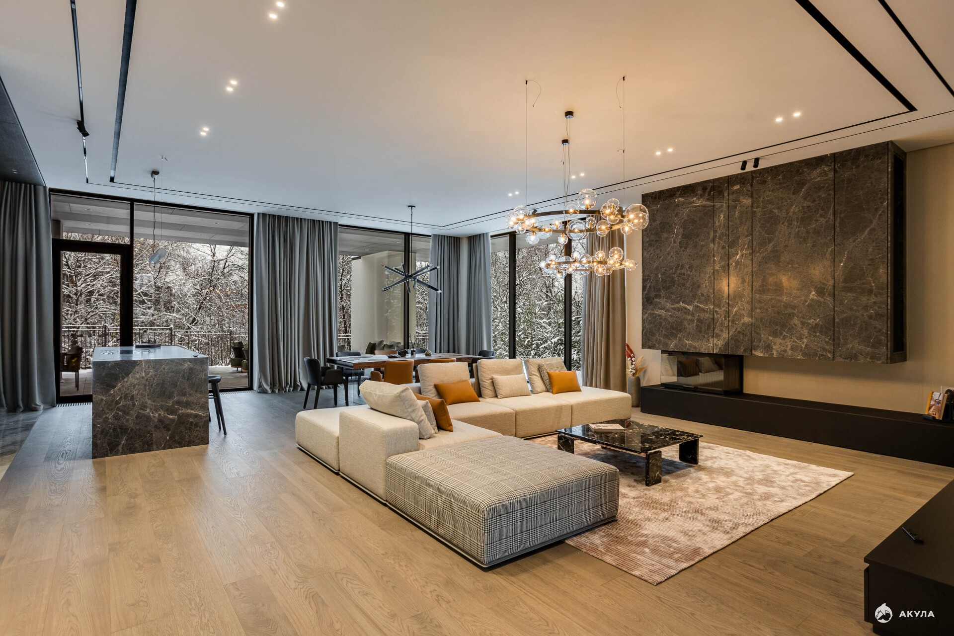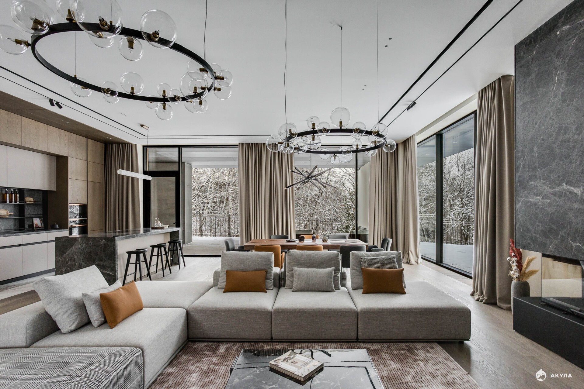 Арт. 93755332. КП Николино. Новый загородный дом расположен рядом с живописным лесом. Панорамное остекление наполняет внутренние пространства естественным светом и ощущением единства с природой. Дизайнерская отделка интерьеров оформлена в спокойной цветовой гамме. Натуральные материалы, камень, дерево и металл в балансе создают атмосферу спокойствия и статусности.