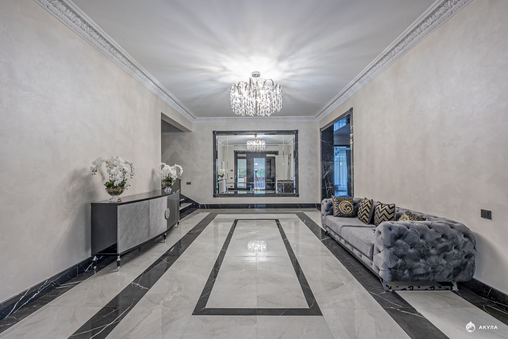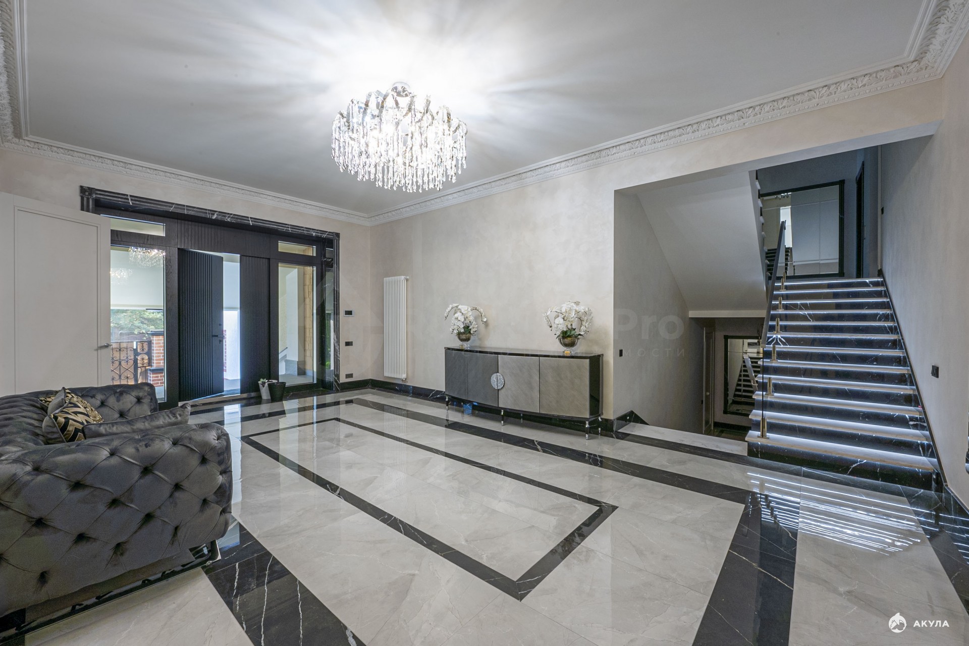 На первом этаже просторная прихожая, гардеробная комната с окном, огромная гостиная с действующим дровяным камином, перед которым можно уютно расположиться с бокалом вина и наблюдать живой огонь, слушая потрескивания поленьев.