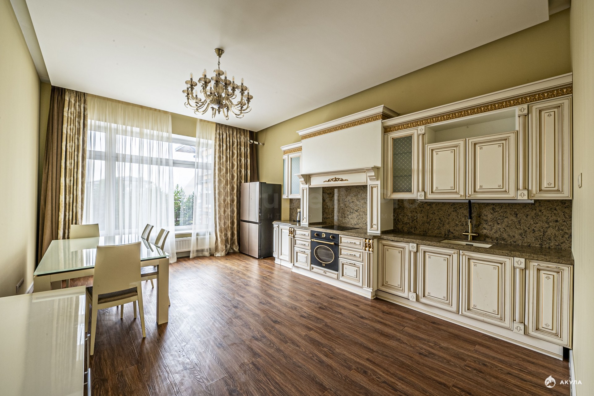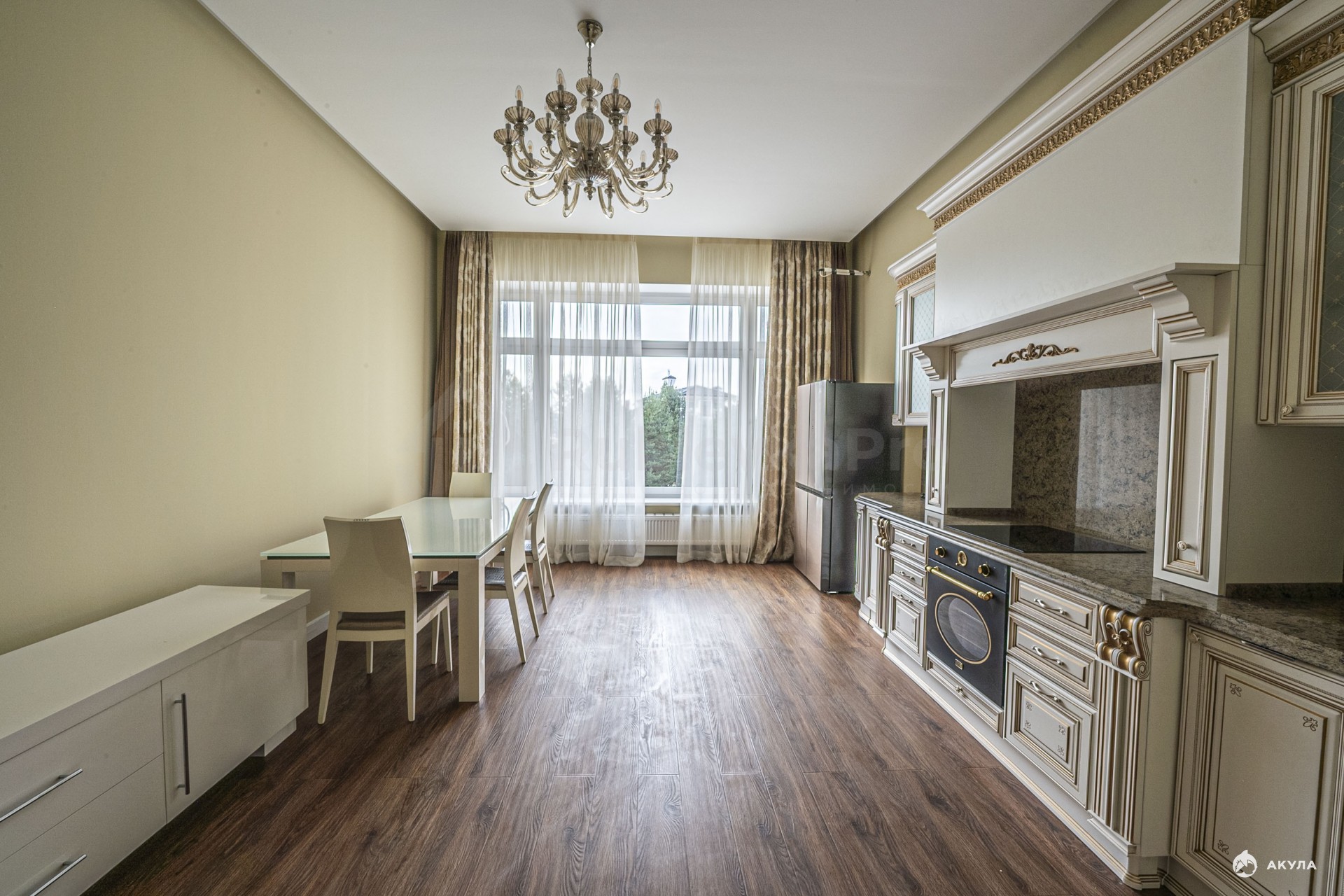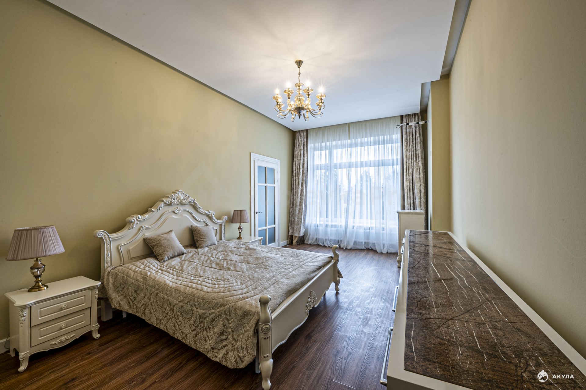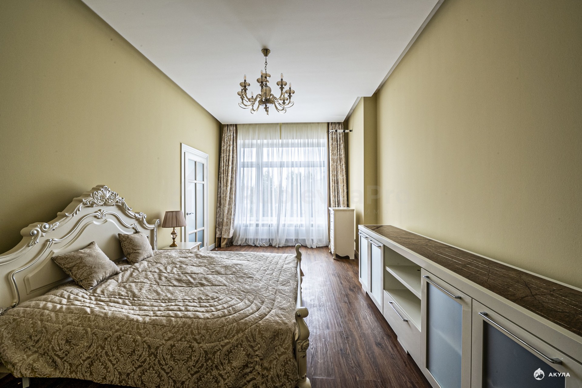 В квартире кухня-гостиная 33 м2, спальня 31 м2 со своим санузлом и гардеробной, прихожая с гостевым санузлом и гардеробной.